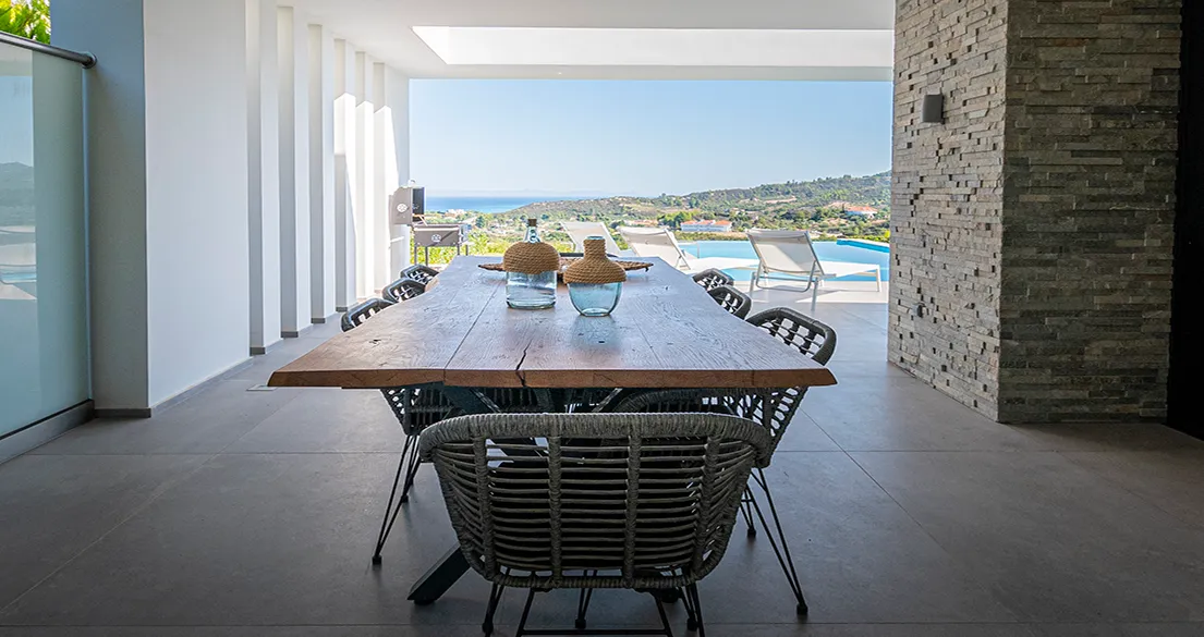 - Veranda: Direct access from the ground floor to the veranda, where there is a canopy and a dining area with a table for 10 people, a 75″ smart TV, comfortable seating with sofas and tables, massage chair, billiard table, table tennis, and outdoor barbecue with running water. The pool area has a south-facing sun terrace with sea view, sun loungers, gazebo, umbrellas, outdoor shower, and a drinks fridge.