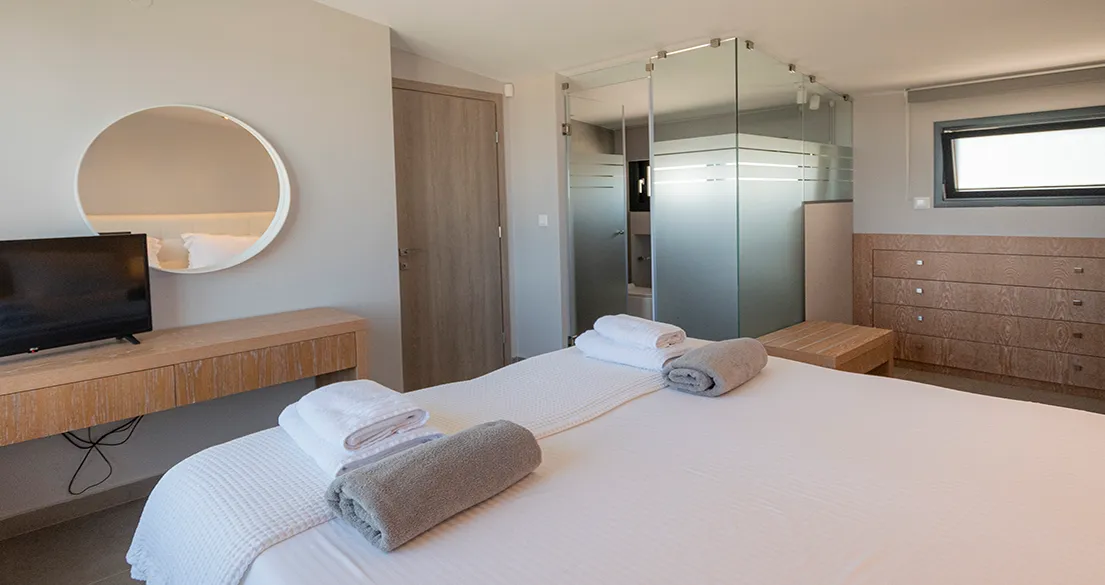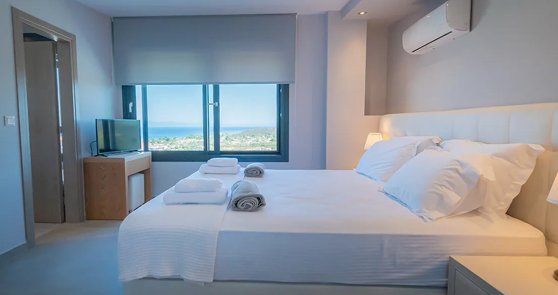 - First floor: 2 double bedrooms, each with an en-suite bathroom (one with bathtub, one with shower and toilet), air conditioning, smart TVs, automatic roller shutters for full blackout, and sea view.