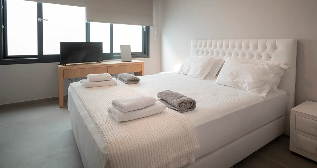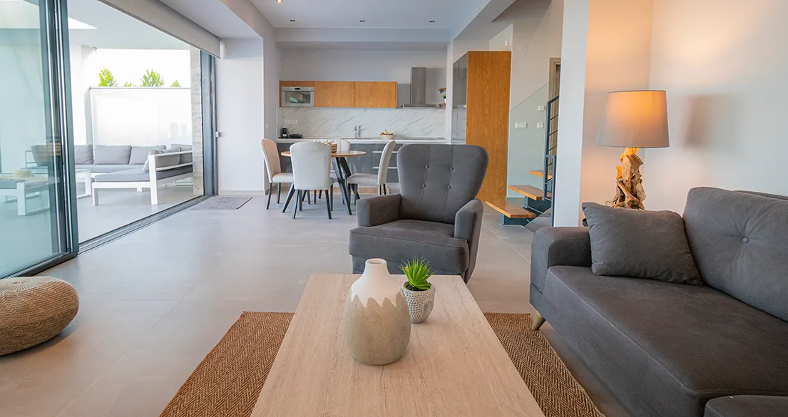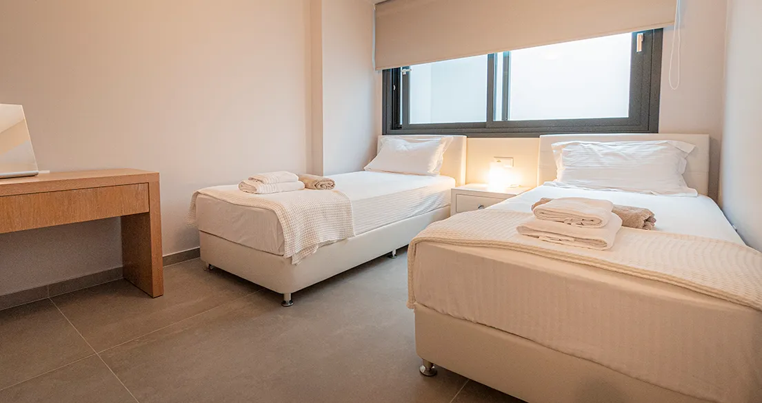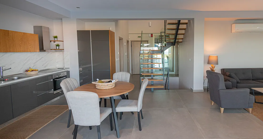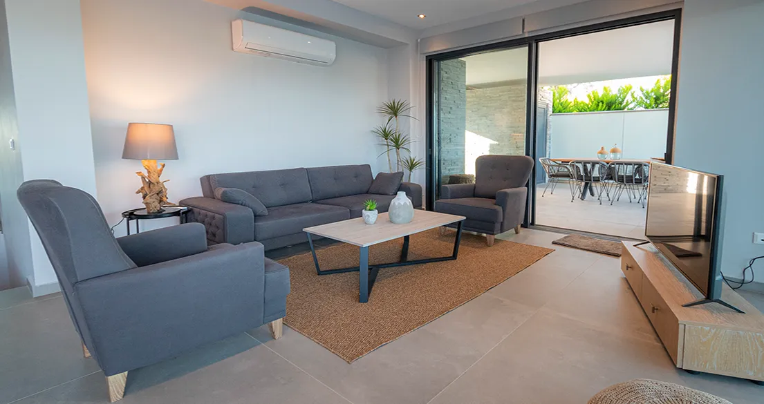 - Ground floor: Spacious living room, 75″ smart TV, sofa (can accommodate 1 child), and air conditioning. Fully equipped kitchen with refrigerator, oven, stove, microwave, coffee machine, dishwasher, and all necessary utensils. One double bedroom with smart TV and air conditioning. Small storage room with vacuum cleaner and cleaning supplies. Bathroom with shower and toilet.